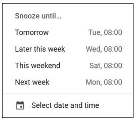 HOVER: If you have the Hover actions enabled in your settings, when you hover over any email (without clicking into it), a number of icons appear on the right hand side. The clock icon is the snooze button…