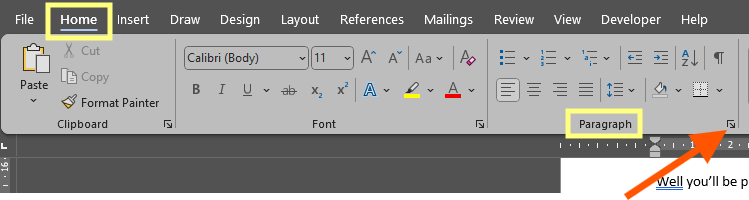 In the Paragraph section, click the small arrow icon in the bottom right corner.