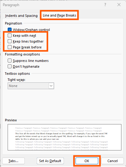 At the top of the Paragraph window, click the Line and Page Breaks tab. This is where Word decides how to handle text across pages.