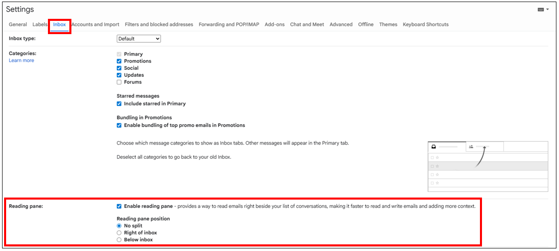 NOTE: When you first enable the Reading Pane, Gmail will reload automatically.