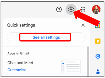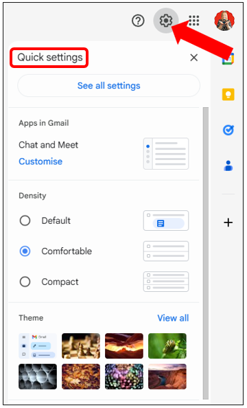 Click the gear icon in the top-right corner of Gmail. This opens your Quick settings panel…